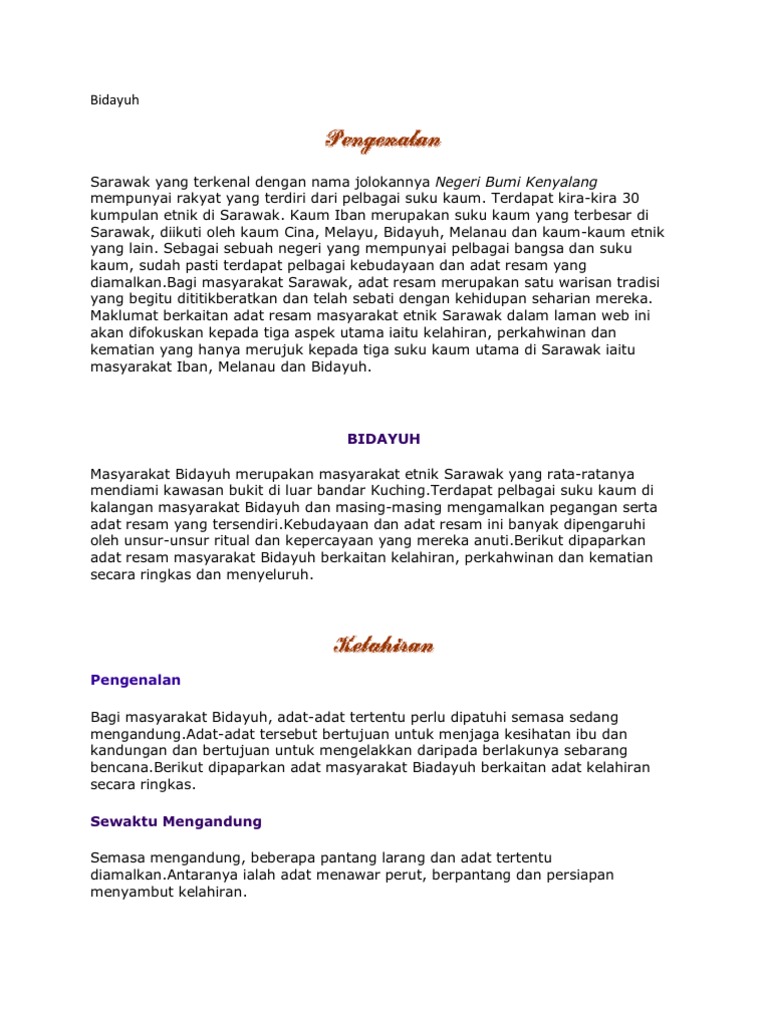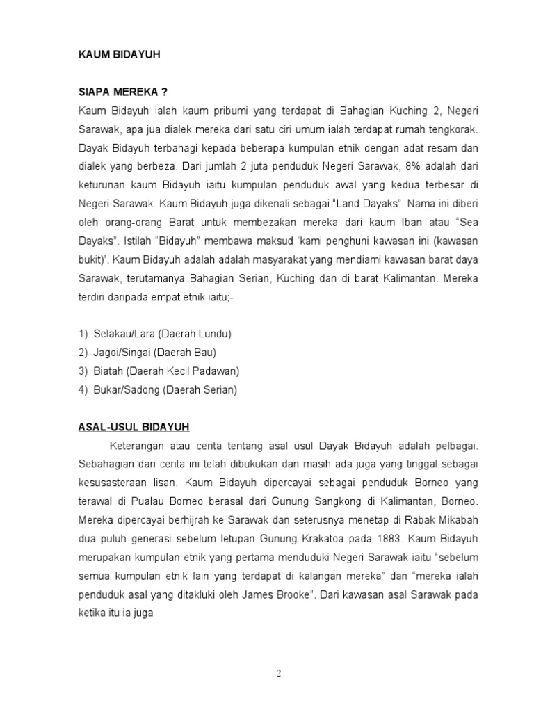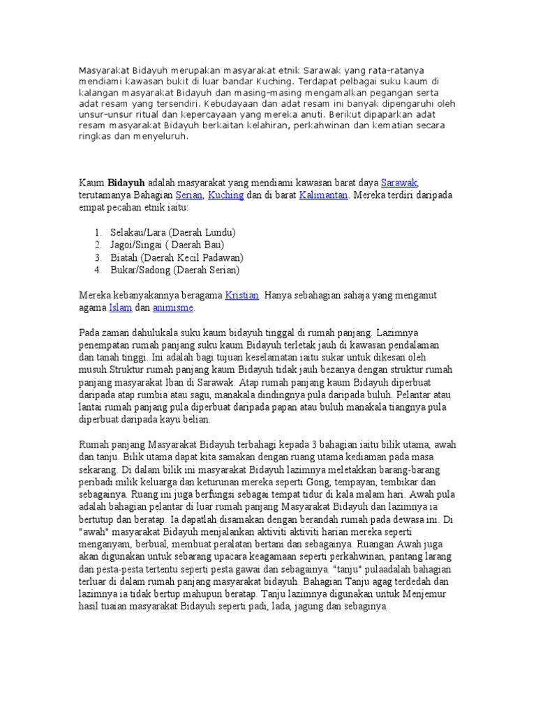 Adat Resam Kaum Bidayuh from imgv2-2-f.scribdassets.com Hasil daripada tugasan ini, kesimpulan yang saya dapati adalah terdapat banyak adat resam dan kepercayaan masyarakat kadazan dusun. Di atas kepercayaan kepada semangat padi maka pelbagai perayaan (gawai) dilakukan pada masa tertentu disepanjang tahun. Adat resam kaum iban secara tradisi kehidupan masyarakat iban diatur oleh adat mereka yang amat rapat berkait dengan sostem pertanian berhuma (bumai) padi. Adat perkahwinan masyarakat melayu sarawak mempunyai banyak persamaan dengan adat sama masyarakat melayu di semenanjung. Adat resam yang di amalkan oleh masyarakat india mempunyai banyak persamaan dengan kebudayaan masyarakat melayu. Savesave adat resam kaum bidayuh for later. Adat resam kaum melanau ibu yang mengandung terikat daripada mengamalkan pantang larang. Resam dan sebagainya dalam kelompok hari ini.