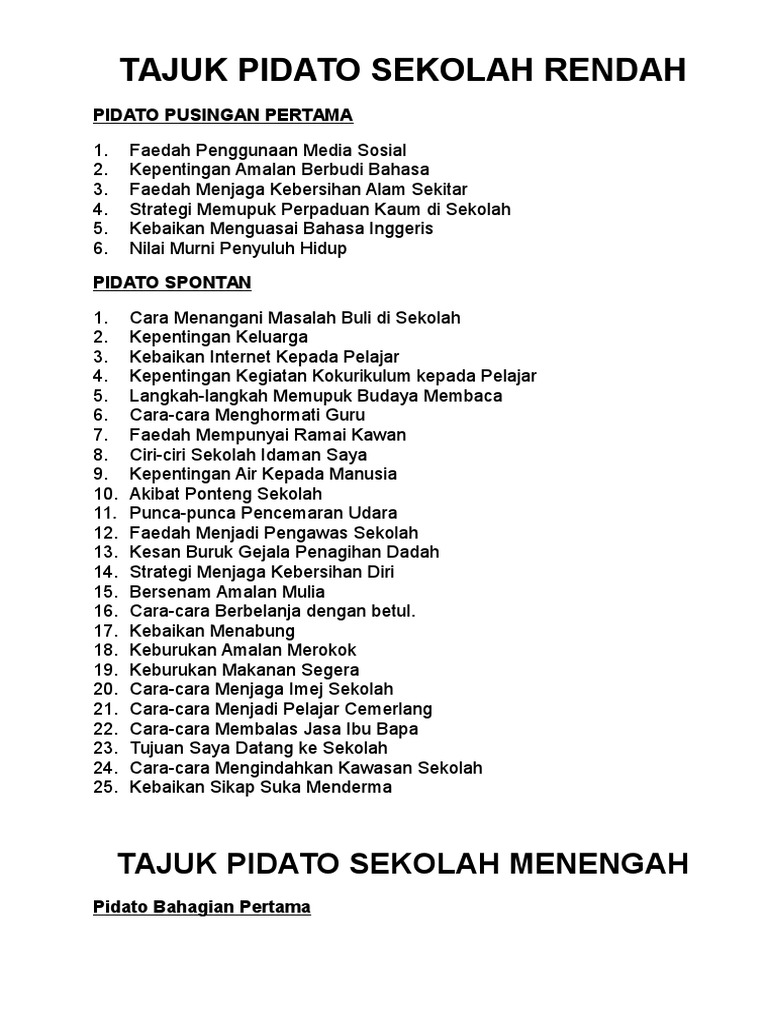 Cikgu nor ekhsan telah menerima segulung ijazah setelah menamatkan pengajian jarak jauh di universiti putra malaysia dan akan bertukar ke sekolah menengah. Sekolah menengah kebangsaan batu muda merupakan sebuah sekolah menengah kebangsaan yang terletak di kampung batu muda, kuala lumpur. Hadirin yang saya muliakan, dalam sektor pendidikan pula, bahasa melayu digunakan sebagai bahasapenghantar dalam sistem persekolahan tidak kira sama ada sekolah kebangsaan ataupunsekolah jenis kebangsaan. Semasa di sekolah menengah, aku sekali lagi menghadapi kesulitan kewangan, terutama untuk. 100 karangan contoh pmr dan spm by zaiton zaba issuu. Tulis teks syarahan anda selengkapnya. Panduan kerja kursus bahasa melayu (penulisan esei berformat) stpm 2013 910/4 kertas 4. Tajuk syarahan ialah ke arah melahirkan masyarakat yang berilmu dan berdisiplin.. 23 orang pelajar menengah 2 ekspres & normal akademik yang mengambil bahasa melayu sebagai bahasa ibunda. Media massa sering memaparkan kehidupan segelintir warga emas yang malang (d) tema sejarah pendidikan: Di sisi yang lainnya, yang tak kalah penting dan menarik dari peran seorang wanita para hadirin sekalian, bahwa wanita bisa memiliki peran yang ganda dalam keluarga yakni sebagai seorang yang dapat menciptakan lapangan kerja baru atau berusaha sendiri. Rujukan adalah laporan rasmi dan data di lapangan. Rancangan ini akan kujalankan sewaktu dia pulang dari sekolah.