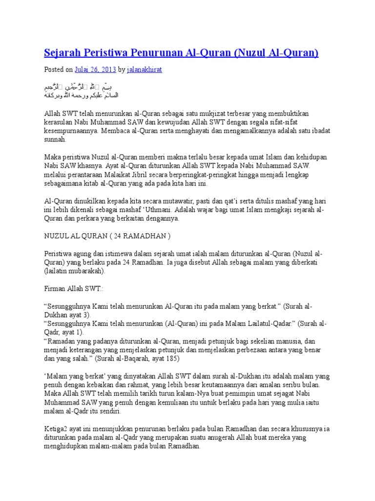 • mengtahuhi subtansi makna ayat al quran dengan adanya asbabun nuzul seseorang bisa menidetifikasi suatu ayat apakah ayat tersebut bersifat khusus atau umum dan kepada siapa sasaran ayat tersebut ditunjukan. Satu rakaman sejarah dalam kehidupan nabi saw hingga seterusnya. Ada ayat yang turun pada peristiwa atau kejadian yang bersifat khusus tapi. Peristiwa nuzul quran ini dianggap sebagai anugerah yang luar biasa dari allah yang berkenan menurunkan al qur'an kepada seluruh umat di akhirnya nuzul qur'an diperingati sebagian umat muslim berdasar tanggal pertama kali al quran diturunkan pada nabi muhammad saw di gua hira. Yang ada pada kita hari ini. Peristiwa itu dikisahkan dalam sebuah firman allah dalam qs. There are 246 days left in the year. Ktn, kul, lbn, phg, pjy, pls, png, prk, sgr, trg. The qur'an is the holy book of islam, which is believed to be a revelation from allah.