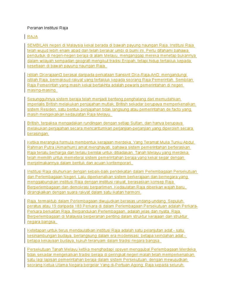 Sultan raja yang di pertuan besar yang di pertuan negeri b ketua kerajaan negeri ialah menteri besar atau ketua menteri. Terdapat dua sebab utama institusi raja ini perlu dikekalkan. Umumnya kita mengetahui malaysia memiliki satu bentuk sistem politik dan pemerintahan yang unik yang mana demokrasi. Menurut sistem beraja ini, raja mempunyai kuasa mutlak dalam setiap pemerintahan dan pentadbiran negeri khususnya sebelum penjajahan inggeris. Sementara itu, professor datuk dr.
